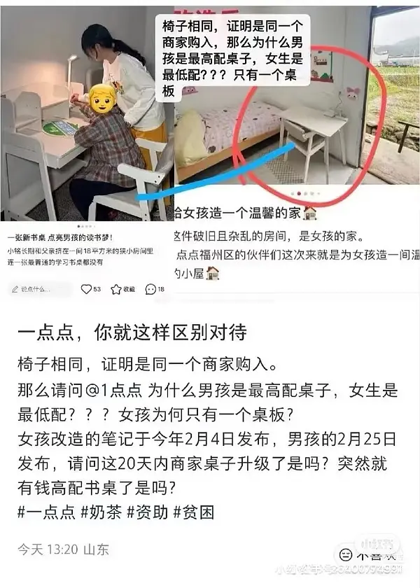 奶茶品牌一点点营销奶茶钱会帮助女孩子改造房间获得良好学习生活环境,实际钱用来给戴小天才手表的男童改造房间,给男童赠送厌女漫画。