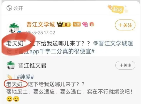 然而,这份说明中关于内容审核的具体标准,却引发了更大的争议。说明中明确**“严禁使用非经汉语权威机构承认的生造字词或短语”**,并举例“老天奶”。但有用户发现,晋江官方账号此前曾使用“老天奶”一词进行内容宣传。在被用户质疑后,相关博文已被删除。