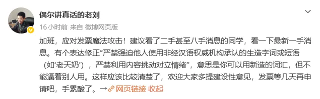 面对用户的集中开票行为,晋江原创网络科技有限公司副总裁刘旭东通过个人微博账号@偶尔讲真话的老刘 公开发文,将用户的开发票行为称为“魔法攻击”,并抱怨员工“手累酸了”,呼吁用户“等几天再申请”。这番言论非但未能安抚情绪,反而引发了更强烈的反弹。