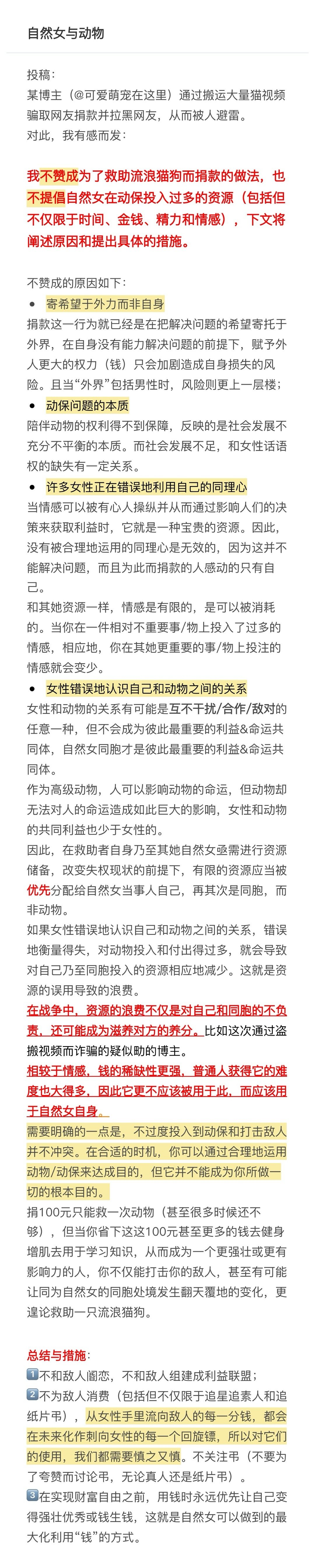 个人成长 #反动保 女权与动物/动保及宠保的关系 在实现财富自由之前,用钱时永远优先让自己变得强壮优秀或钱生钱,这就是自然女可以做到的最大化利用“钱”的方式。 1️⃣当下的动保问题,其本质是㽖社的问题。因此,试图解决动保问题,就是在给㽖社打补丁。 2️⃣没有什么高于女性的权力和利益,无论是生态环境、动物福利、还是别的任何和女权无关的事物。不支持将女权和动/宠保等任何别的名目进行捆绑。 女权只专注维护女性权益,不为任何别的物与事负责。